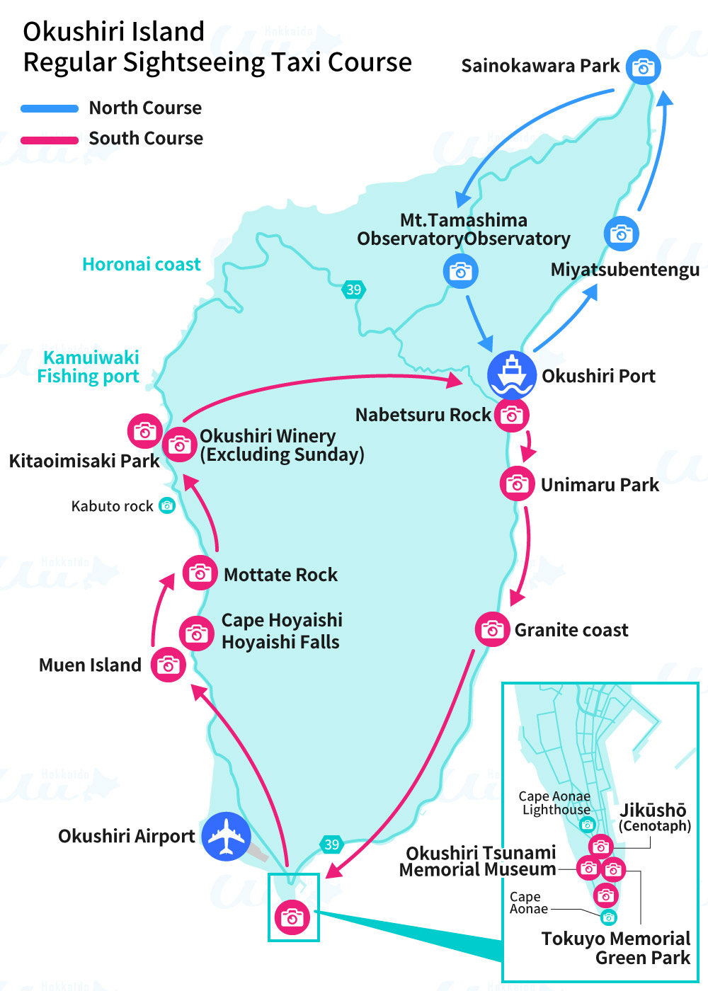 Okushiri Port (3:30 p.m.) → Nabetsuru Iwa → Unimaru Park → Mikageishi Beach → Okushiri Island Tsunami Memorial Museum → Jikusho (Cenotaph) → Norihiro Memorial Ryokuchi Park → Muenjima Island → Hoyaishi・Hoyaishi Waterfall → Mottatsu Iwa → Kitaoimisaki Park → Okushiri Winery (except Sunday) → Okushiri Port (6:00 p.m.)