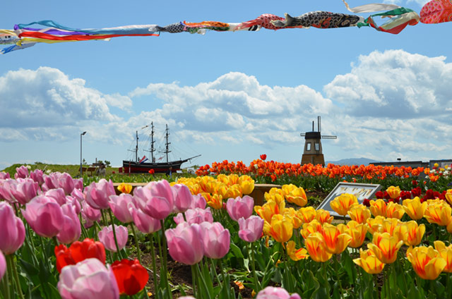 The Saraki Cape Tulip Fair is held at Saraki Cape, known for the birth of the Kanrin Maru, where thousands of tulips, recognized as the national flower of the Netherlands, bloom in splendor.