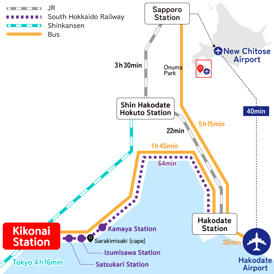 • Hakodate Station – Kikonai Station (South Hokkaido Railway) about 64 min.