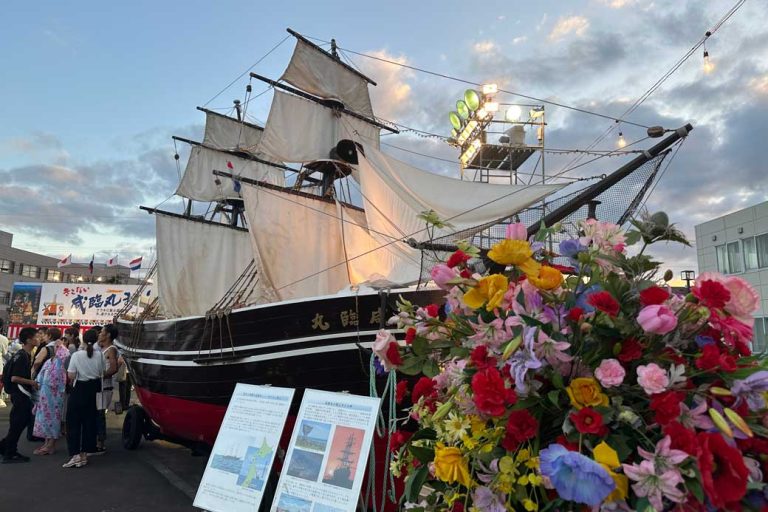 The Kanrin Maru, which played an active role in the late Edo period and achieved the first trans-Pacific crossing, ran aground and sank off the coast of Saraki Cape in Kikonai cho. It still rests in the sea of Kikonai today. This festival, themed around the Kanrin Maru, energizes Kikonai in midsummer with various events.