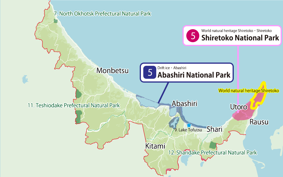 Abashiri Quasi-national ParkMt. Tento, Cape Notorp, Koshimizu Primeval Flower Garden, Wakka Primeval Flower Garden, Lake Saroma, Lake Abashiri, Lake Tofutsu |